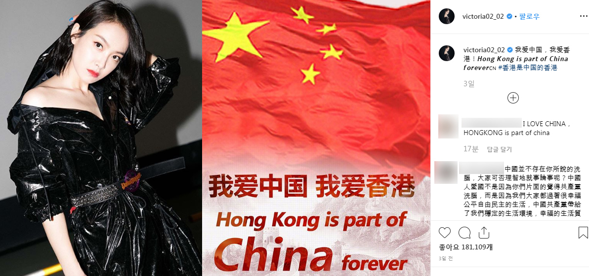 빅토리아는 2019년 8월 15일 오후 자신의 인스타그램에 “Hong Kong is a part of China”라는 문구가 적힌 사진을 게재했습니다. 공개된 사진에는 중국의 국기인 오성기와 함께 ‘Hong Kong is a part of China Forever’라고 쓰여있습니다.