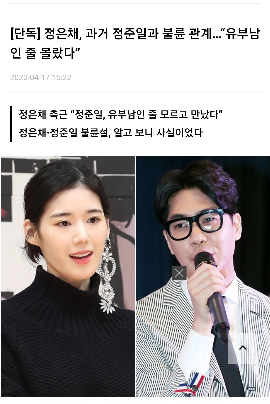 아내가 된 여성은 자신의 꿈이었던 외국 대기업까지 퇴사하고 정준일과 살기 위해 파주에 신혼집을 준비중이었는 데, 정준일은 또 다시 정은채와 재회해 연애를 즐겼다고 합니다. 참다못한 아내가 정준일과의 관계를 정리한 사실이 알려지며 뒤늦게 공론화 됐습니다. 하지만 정은채는 "정준일과 사귄 것은 맞지만, 유부남인 줄 모르고 만났다, 정준일이 날 속였다"라고 강력 반박에 나섰는 데, 정준일은 "유부남인 걸 모를 수 없는 상황이었다, 거짓말이다"라는 주장으로 진흙탕 싸움을 시작했습니다. 보다못한 전 아내가 둘 다 불륜임을 인지하고, 수 년 간 연애해온 사실을 폭로해 정은채는 모든 광고계에서 퇴출 되는 듯 했습니다.