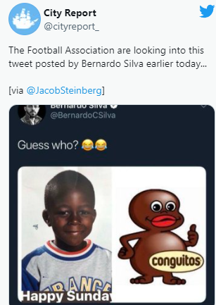 3. 2019년 맨체스터 시티의 베르나르도 실바가 인종차별주의 트윗을 올린 게시글이 논란이 되었습니다.