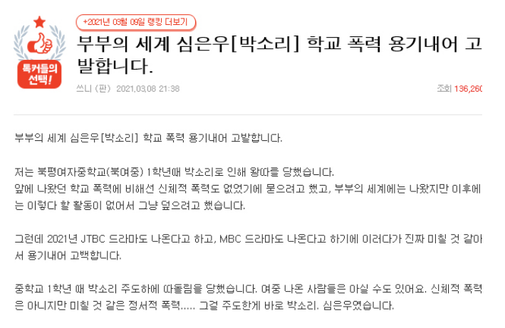 그러나, 2021년 3월 부부의 세계에 출연했던 배우 심은우가 자신을 둘렀단 학폭 의혹에 대해 거의 한달 만에 인정하고 사과하였습니다. 심은우 소속사 측은 "3월 초 학폭 의혹이 제기되었을 당시에는 적극적으로 부인하며, 온라인 커뮤니티에 올라온 글을 보고 본인과 주변 지인들에게 확인한 결과 "글 작성자와 사이가 안 좋았던 건 사실, 하지만 물리적인 폭력이나 사회적으로 문제가 될만한 행동은 하지 않았다"라고 밝혔었는 데요.