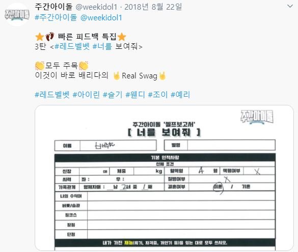 아이린은 낯가림이 심한 편이라고 합니다. 그래서 모르는 사람 앞에서는 잘 웃지도 않는 성격이라고 하는 데요. 주간아이돌에 출연했을 당시 방송사 측에서 나눠준 셀프 보고서 설문지에 답변을 무성의하게 했다는 논란이 터지기도 했는 데요. 보통 이런 설문지를 받으면, 어느 정도 채워서 내는 게 일반적이지만, 거의 텅텅 비우다시피 했습니다. 아이린의 이런 무성의한 설문지로 결국 제작진 측에서 자체적으로 작성해 방송에 내보냈다고 합니다.