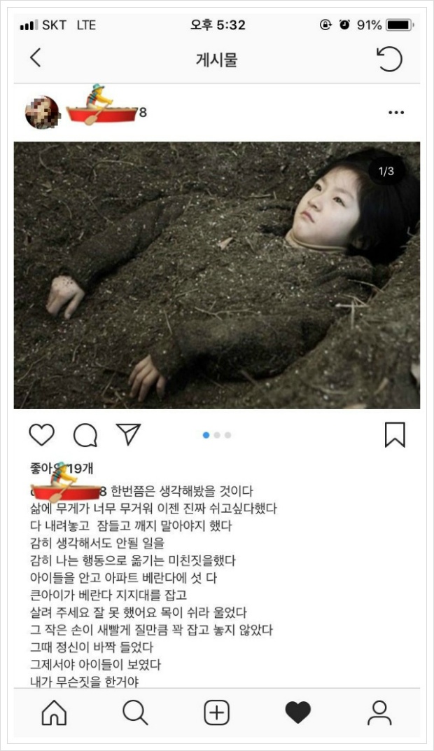 김새론 엄마는 인스타에 김새론이 흙에 묻혀있는 사진을 개재하며 글을 썼는데요. 네티즌은 "동반자살 글을..", "저런 얘기를 왜 공개하나" 라는 등의 비난이 일었습니다.