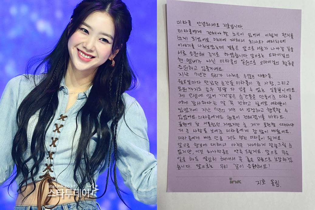 지호는 공식 팬카페에 손편지를 게재했습니다. “미래에 대해서 회사와 여러 차례 이야기를 나눠보았는데 결론은 앞으로 서로가 나아갈 길을 서로 응원해 주기로 했다”며 “앞으로 오마이걸의 한 멤버가 아닌 미라클의 일원으로 오마이걸의 활동을 응원하고 있을 거다”고 적었습니다.