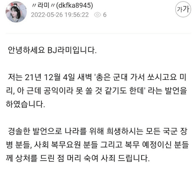 2021년 12월에 있었던 공익 비하 발언에 대해 올해 5월 26일 자신의 아프리카 방송국을 통해서 "경솔한 발언으로 나라를 위해 희생하시는 모든 국군 장병분들, 사회 복무요원 분들 그리고 복무 예정이신 분들께 상처를 드린 점 머리 숙여 사죄드립니다"라고 사과문을 게재했습니다. 평소에 감사한 마음을 가지고 있지 않았기 때문에 나온 발언이었다고 합니다. 또한 발언 당시 "저로 인해 상처받은 분들의 마음을 제대로 헤아리지 못해 진심어린 사과를 드리지 못했다"며 "그 과정에서 시청자분께 상처를 드리는 욕까지 하고 말았다. 저 자신이 부끄럽고 참담한 심정이다"라며 고개를 숙였습니다. BJ 라미가 6개월 만에 공익 비하 발언에 대해 사과를 하게 된 것은 최근 BJ 효딤이 군인 비하 발언을 했다는 논란때문에 불똥이 튄 것으로 보입니다.