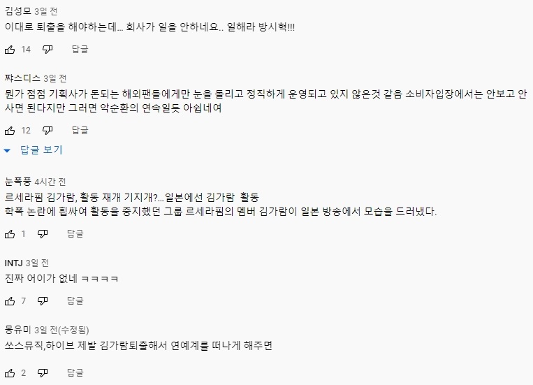 아무튼 김가람 최근 논란에 대해 유튜브 댓글의 반응을 살펴보면 "쏘스뮤직, 하이브 제발 김가람 퇴출해서 연예계를 떠나게 했으면, 이대로 퇴출을 해야 하는데...회사가 일을 안하네요.. 일해라 방시혁!!!" 등의 비난 섞인 반응을 보이고 있습니다.