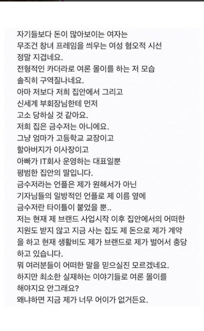 이후 얼짱출신 '강혁민'과 언쟁을 벌이던 중 '자기보다 돈이 많아보이는 여자에게 창X 프레임을 씌우는 여성혐오적 시선이 지겹다.', '저희집 금수저는 아니에요', '엄마가 고등학교 교장이고 할아버지가 이사장이고, 아빠가 IT회사를 운영하는 대표일 뿐 평범한 집안의 딸입니다', '금수저란 언플은 제가 원해서가 아닌 기자들의 일방적인 언플로 생긴 것입니다.'라며 본인이 금수저가 아니라는 사실을 밝혔었습니다.