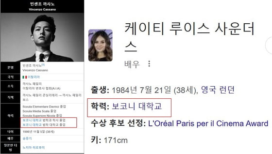 송중기가 드라마 '빈센조'에서 연기했던 빈센조는 극 중 보코니 대학교를 졸업했습니다. 그런데 케이티는 실제 해당 대학교 졸업생으로 송중기가 '빈센조' 출연당시 그녀로부터 이탈리아와 영어를 배우면서 그와 인연을 맺은 것이 아니냐는 추측이 제기되고 있습니다.
